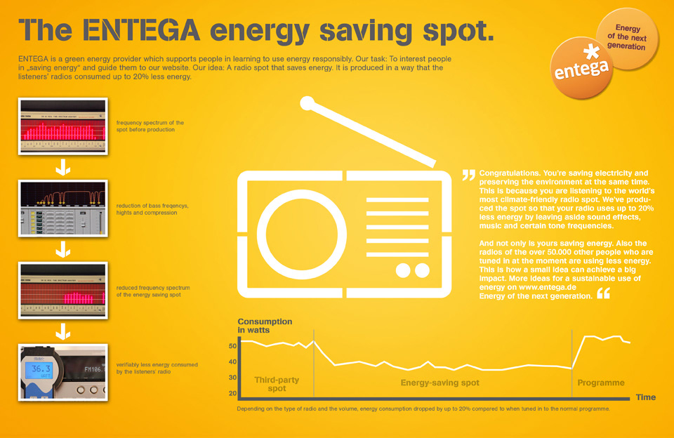 Der Ökostrom-Anbieter Entega motiviert seine Kunden, Strom zu sparen. Und zwar mit einem Radiospot, der selbst Strom spart. Diese Idee war der Radio-Jury in Cannes 2012 einem Löwen wert.